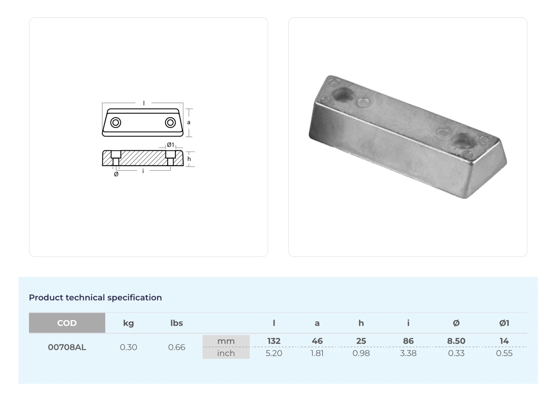 Anod i aluminium (00708AL), 852835. Sköldanod för Volvo Penta AQ290