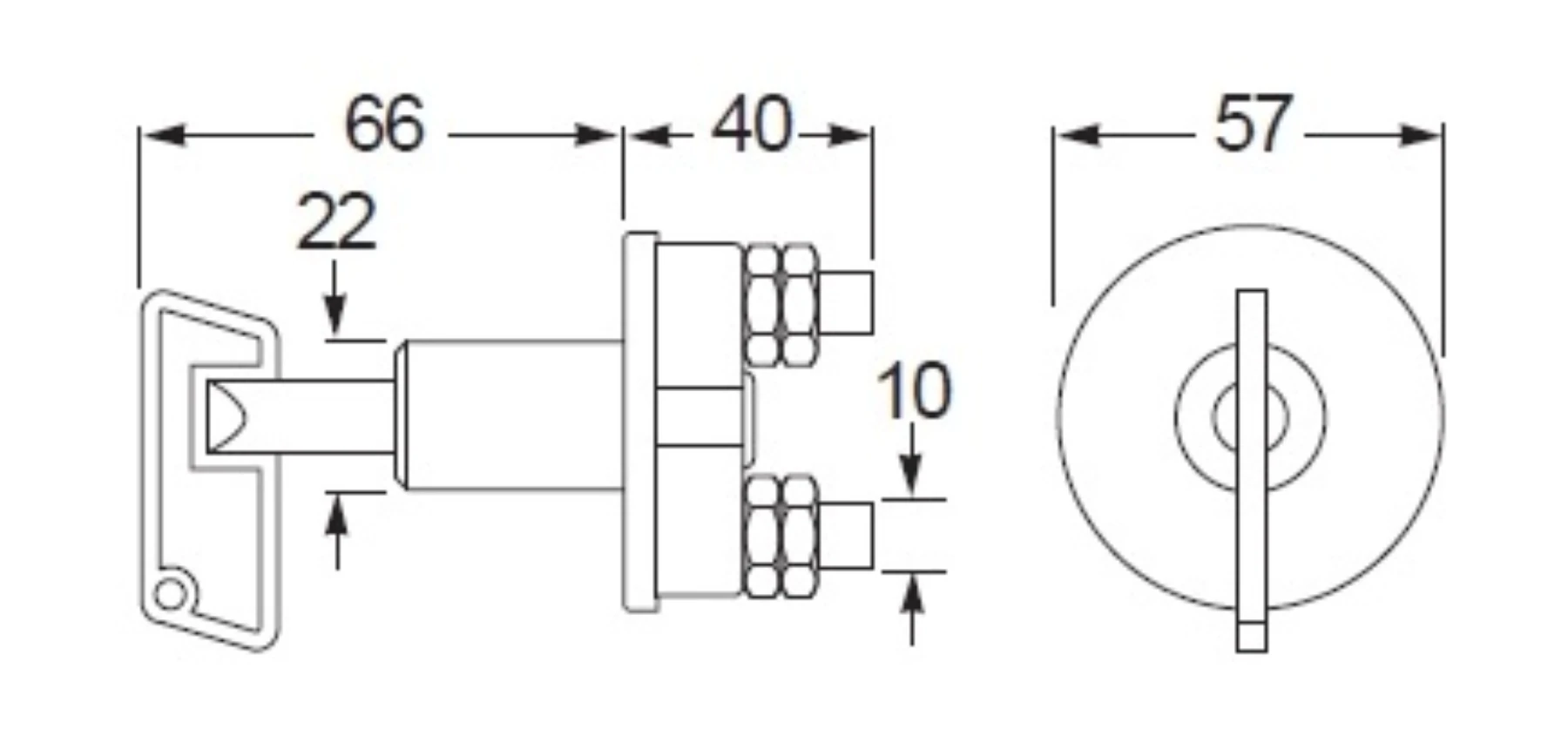 Huvudsrömbrytare med kontinuerlig kapacitet på 100A @ 12V / 50A @ 24V med löstagbar nyckel i off-läget. Kontruerad i slagtålig plast.