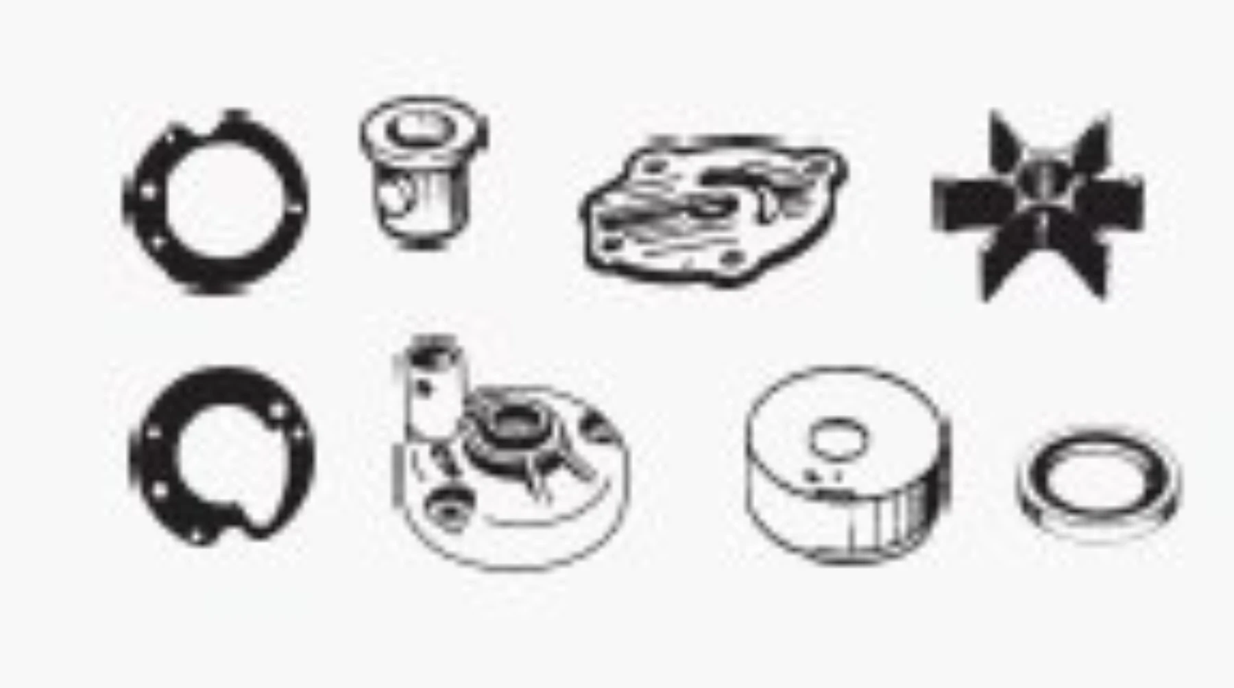 Komplett renoveringssats för vattenpump med packningar, impeller och pumphus.